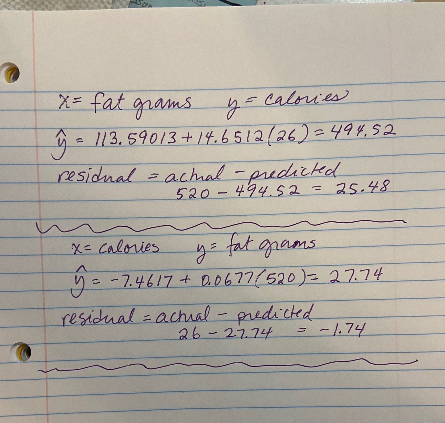 The linear model underestimated for the Quarter Pounder when the explanatory variable was fat and overestimated when the explanatory variable was calories. Was this going to be true for each of the other eight burgers? Why? I’ll leave you to chew on that for a while, and if you want, you can put your explanation in the comments.
