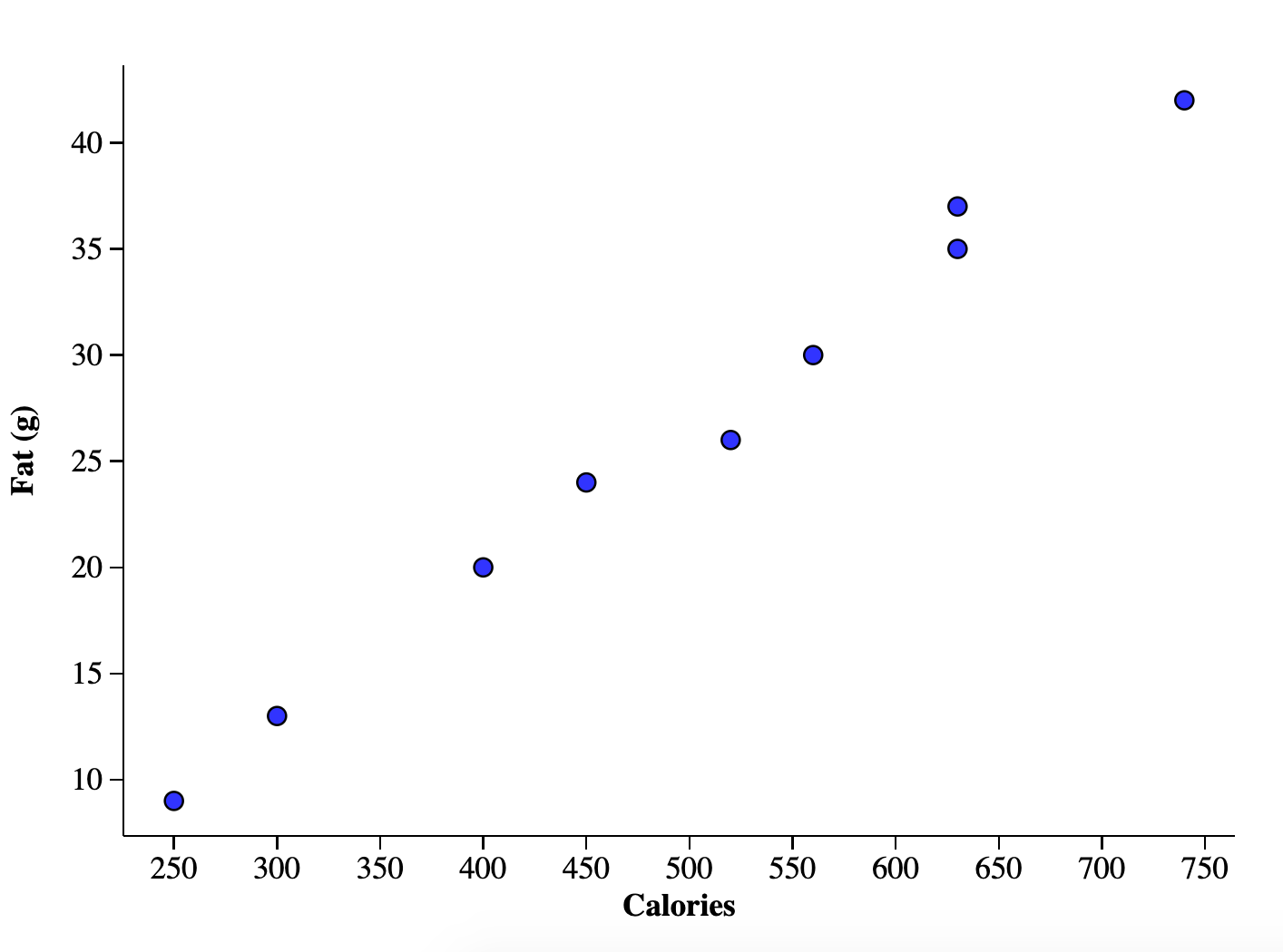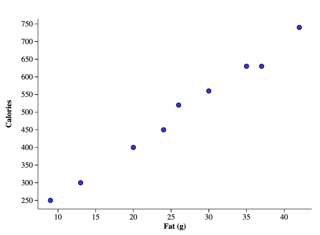 Of course the amount of fat in a burger will contribute to the number of calories so the relationship is positive.