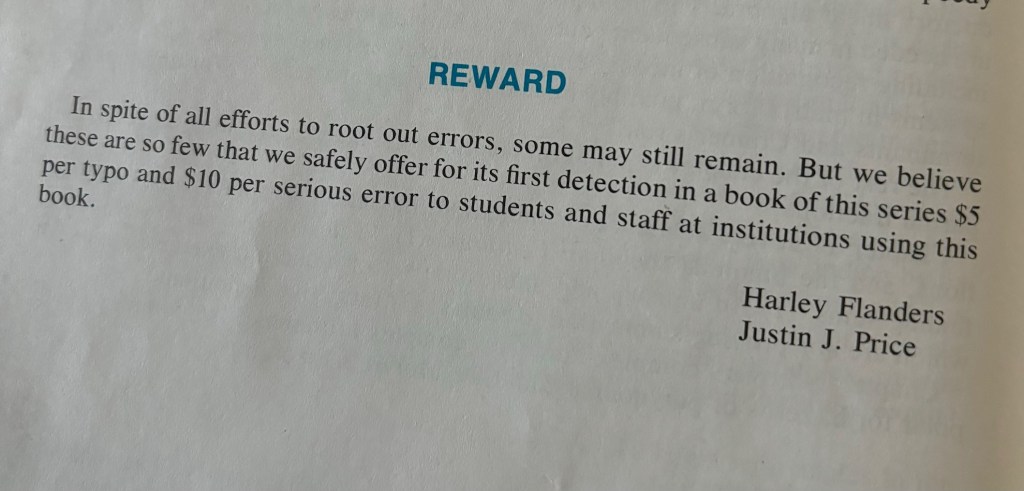 At the time I thought it was amazing that I could get PAID if I found an error. (Spoiler alert: I never found an error in that textbook.) But looking back, I realize what seeped deeper into my burgeoning math soul was the admission that there was a possibility that some errors might remain even after they had worked hard to eradicate them AND that I could take it upon myself to tell them about it. How fantastic that two mathematicians were acknowledging that they could have a mistake and soliciting my opinion!