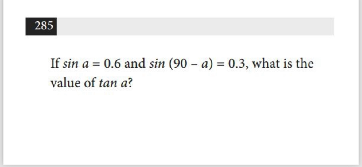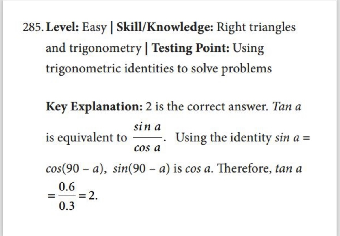 I was helping a few students with some SAT math practice, filling in on short notice because their teacher had an emergency, and using this book from Vibrant Publishers. I had never used this particular book before and I definitely did not have time to do all the problems. When one student asked me about question 285, I immediately went to solving it using geometry since I knew not everyone in the room would have seen or remembered the identity sin(90 – a) = cos a.