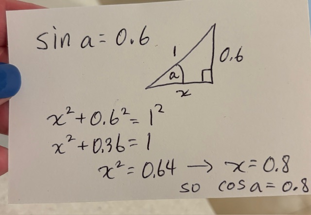 Students, this is so exciting! We have just found a mistake in this book! But it wasn’t a mistake in the answer key, since it was an alternate, correct method for finding the solution. So why did the solutions not match? Because it was a mistake on the part of the person writing the question. Because if sin a = 0.6, then sin (90 – a) = cos a = 0.8, not 0.3. Good ole Pythagorean Theorem.
